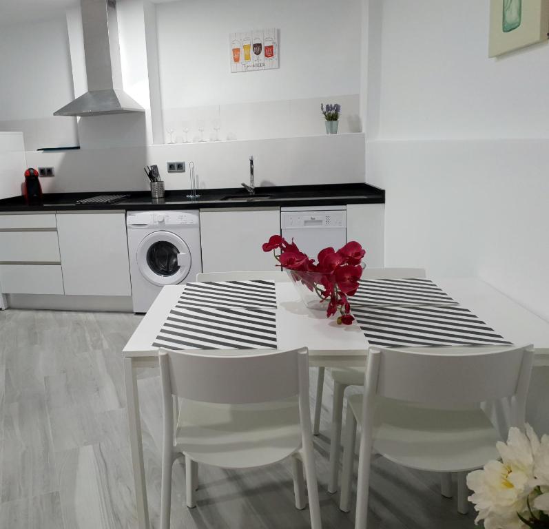 COCINA: Armarios de cocina con utensilios básicos para 2/3 personas: platos, vasos, copas, tazas, cubiertos, cazuelas, sartenes… Utensilios básicos de limpieza: tendedero de ropa, aspiradora, escoba, recogedor, cubo, fregona… Como cortesía de bienvenida en la cocina hay detergente lavavajillas a mano.