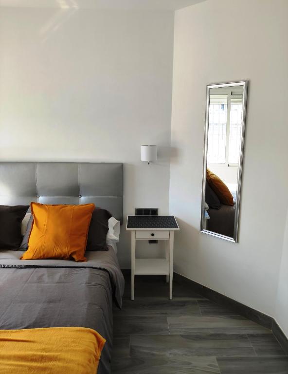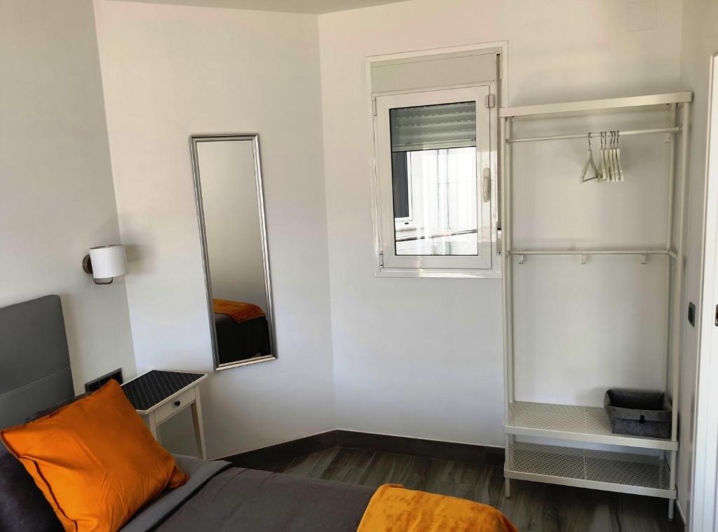 DORMITORIO: 1 cama doble (150cm x 200cm 2 Personas máximo), mesita de noche, armario y perchero. Balcón (tipo Juliet) con vistas a calle Granada.