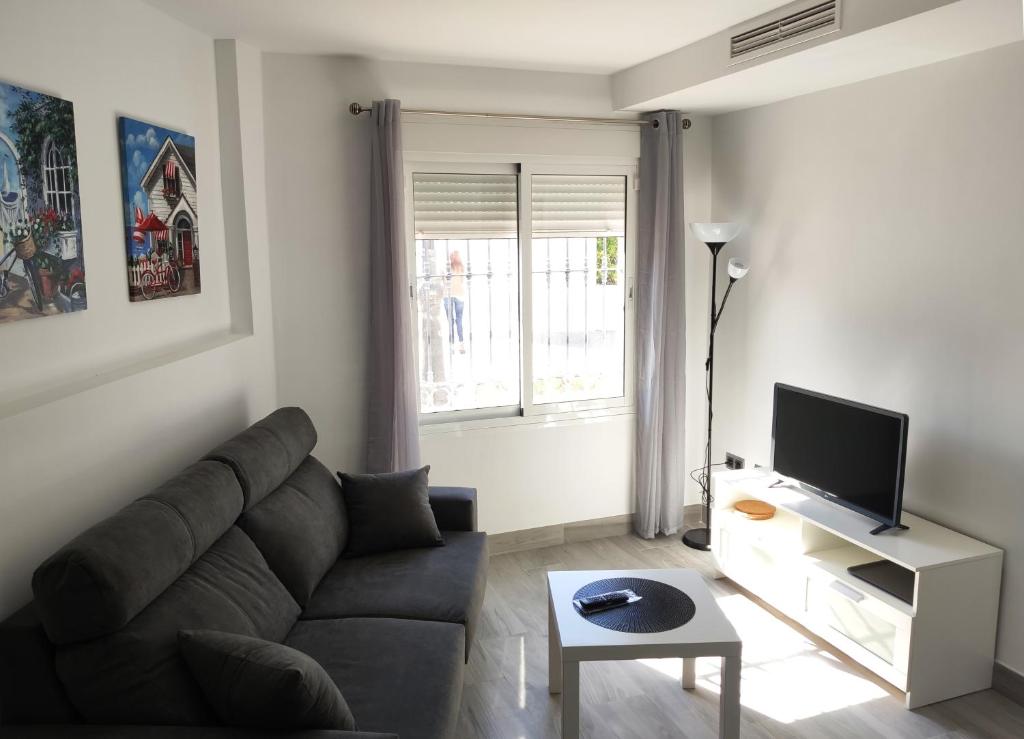 SALÓN-COMEDOR: Ventanal con vistas al jardín, 1 sofá cama (1 adulto), 1 mesa auxiliar, 1 mesa de comedor, 4 sillas comedor. Smart T.V., Red Wifi, Aire Acondicionado/Calefacción
