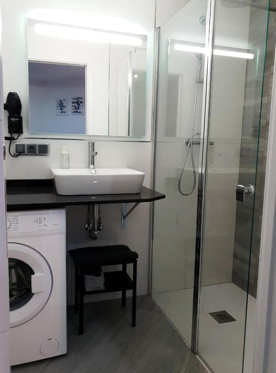 CUARTO DE BAÑO: En el dormitorio (tipo suite). Ducha a ras de suelo con mamparas de cristal correderas, inodoro, lavabo y secador de pelo. Como cortesía de bienvenida habrá jabón neutro y papel higiénico.