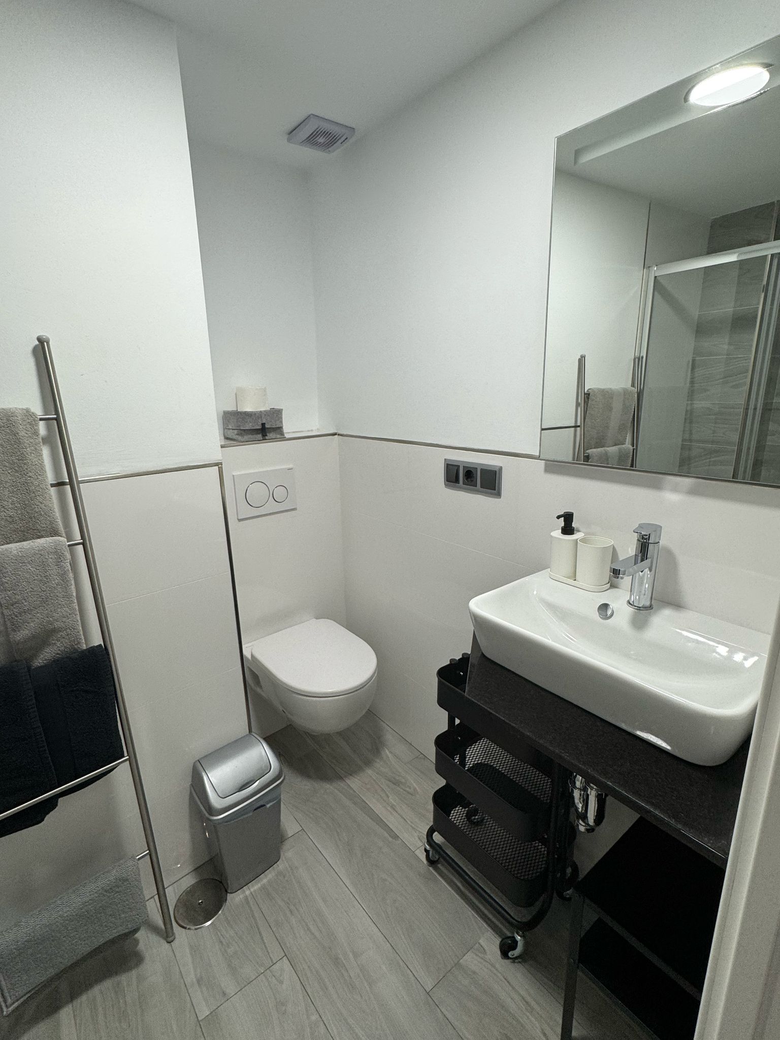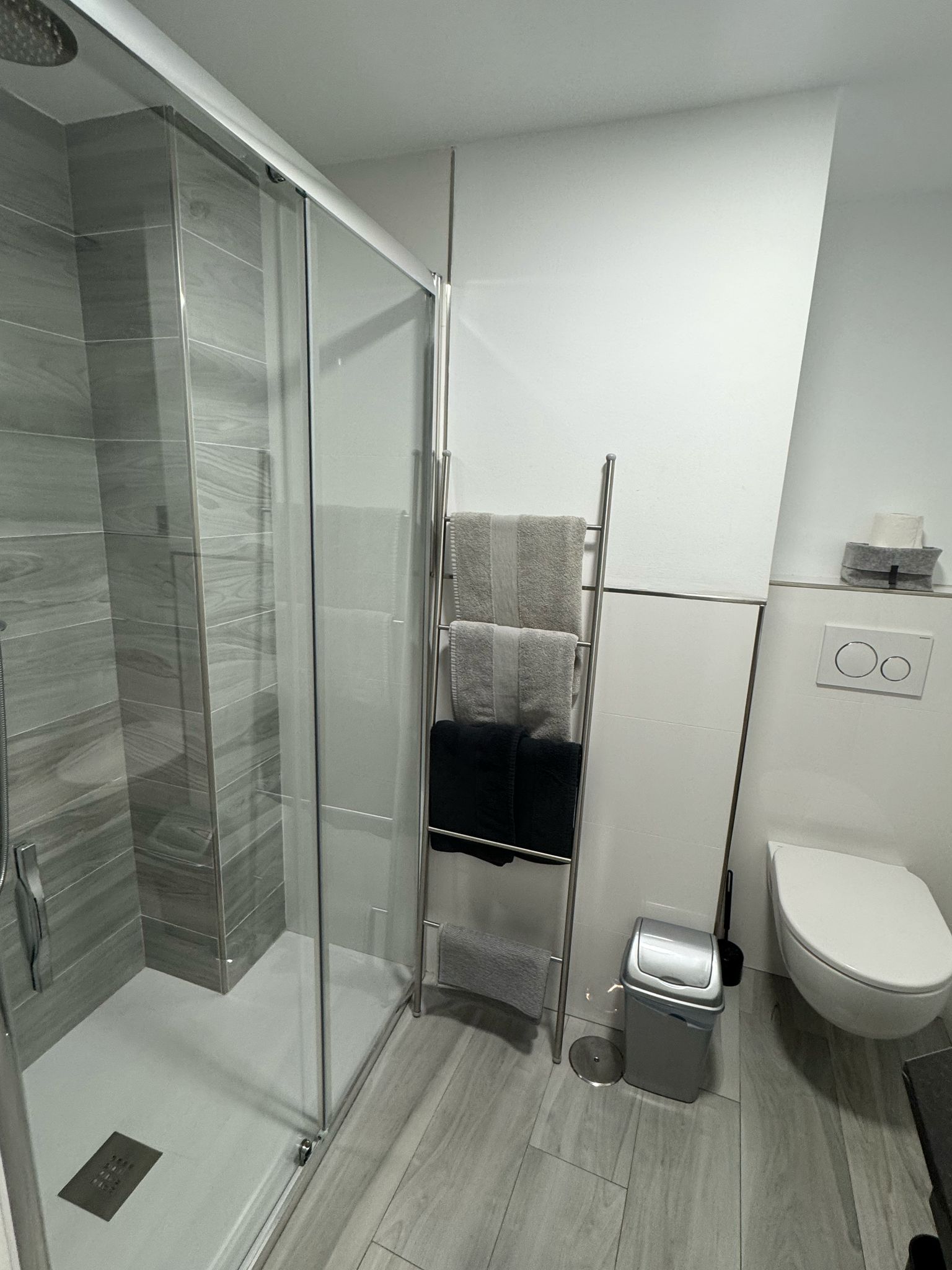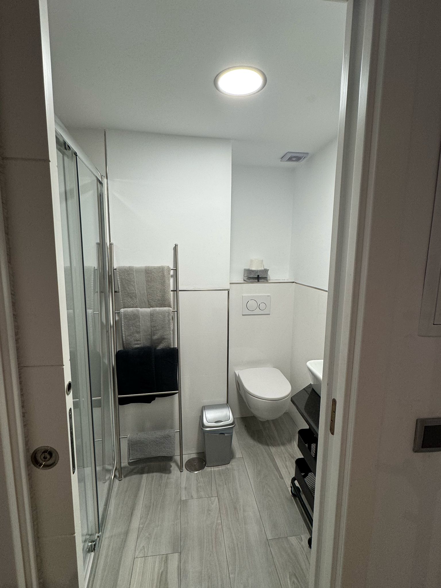 CUARTO DE BAÑO 2: Junto al dormitorio. Ducha a ras de suelo con mamparas de cristal correderas, inodoro, lavabo. Como cortesía de bienvenida habrá jabón neutro y papel higiénico.