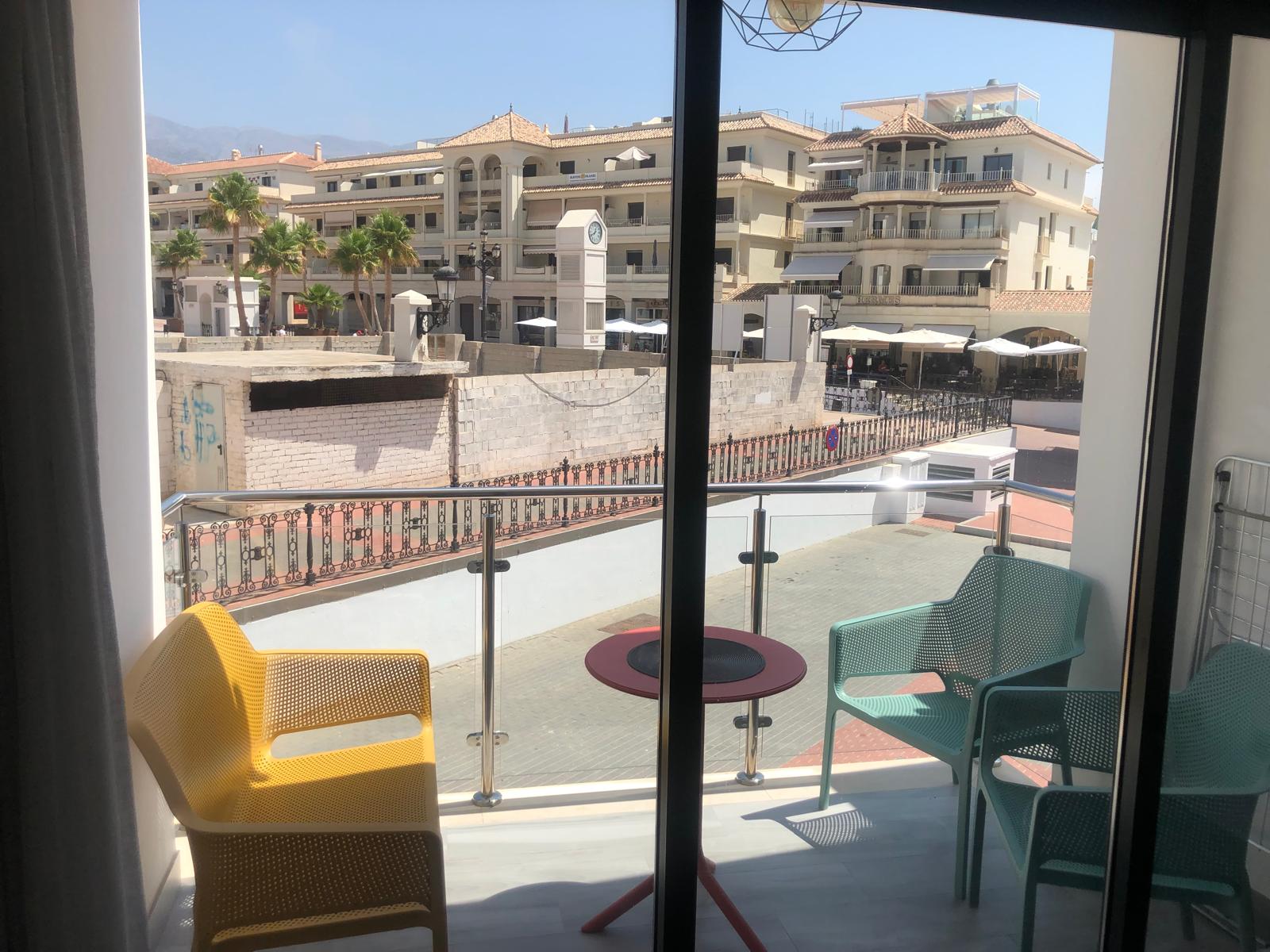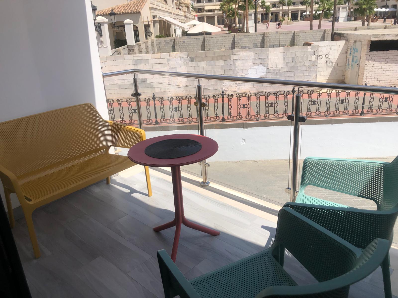 El Apartamento 4 de Gran8Nerja está situado en la primera planta del edificio (no es planta baja) y cuenta con un amplio balcón-terraza equipado con cómodos sillones exteriores y con vistas a Plaza España.