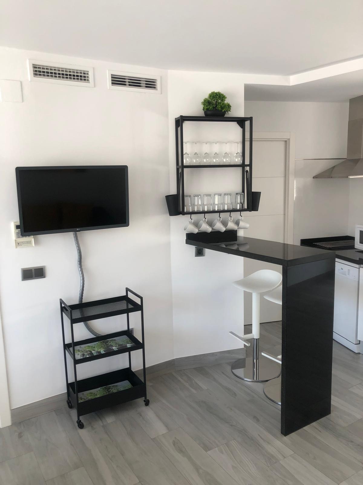 COCINA: Integrada en el salón-comedor y completamente equipada. Cuenta también con barra de desayuno y 2 taburetes. Armarios de cocina con utensilios básicos de cocina para 4/5 personas: platos, vasos, copas, tazas, cubiertos, cazuelas, sartenes. Armario escobero con utensilios básicos de limpieza: tendedero de ropa, fregona, cubo, escoba, recogedor. Como cortesía de bienvenida en la cocina habrá bolsa de basura detergente lavavajillas y limpiador desinfectante multiusos.